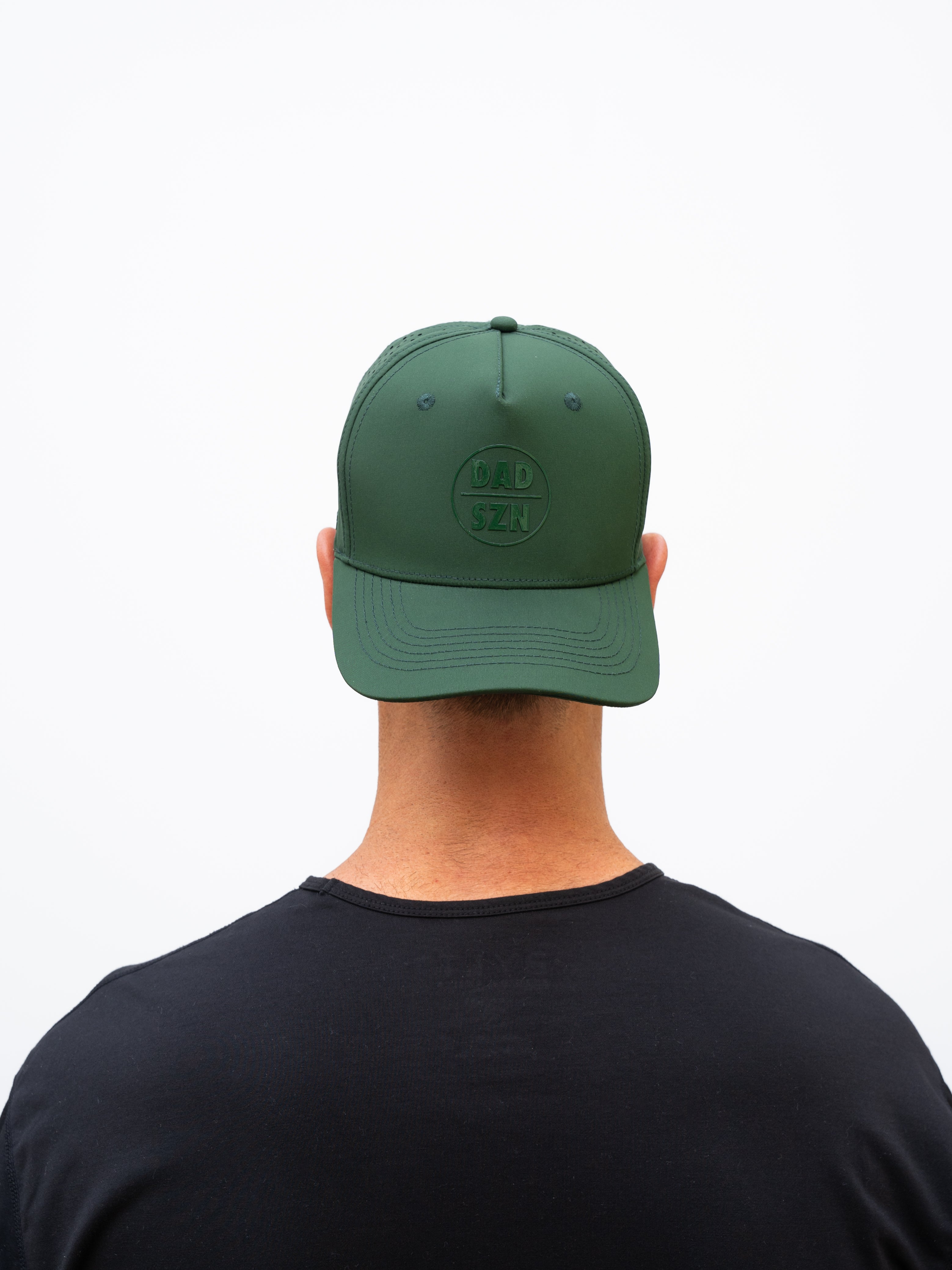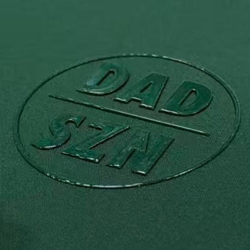 This dark green five-panel hat features a monochromatic DAD SZN circle application with a subtle glossy texture that catches the light just enough to stand out while keeping a refined, understated look.
