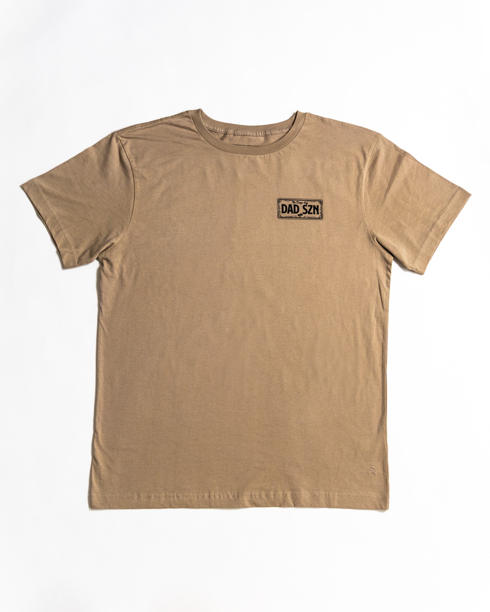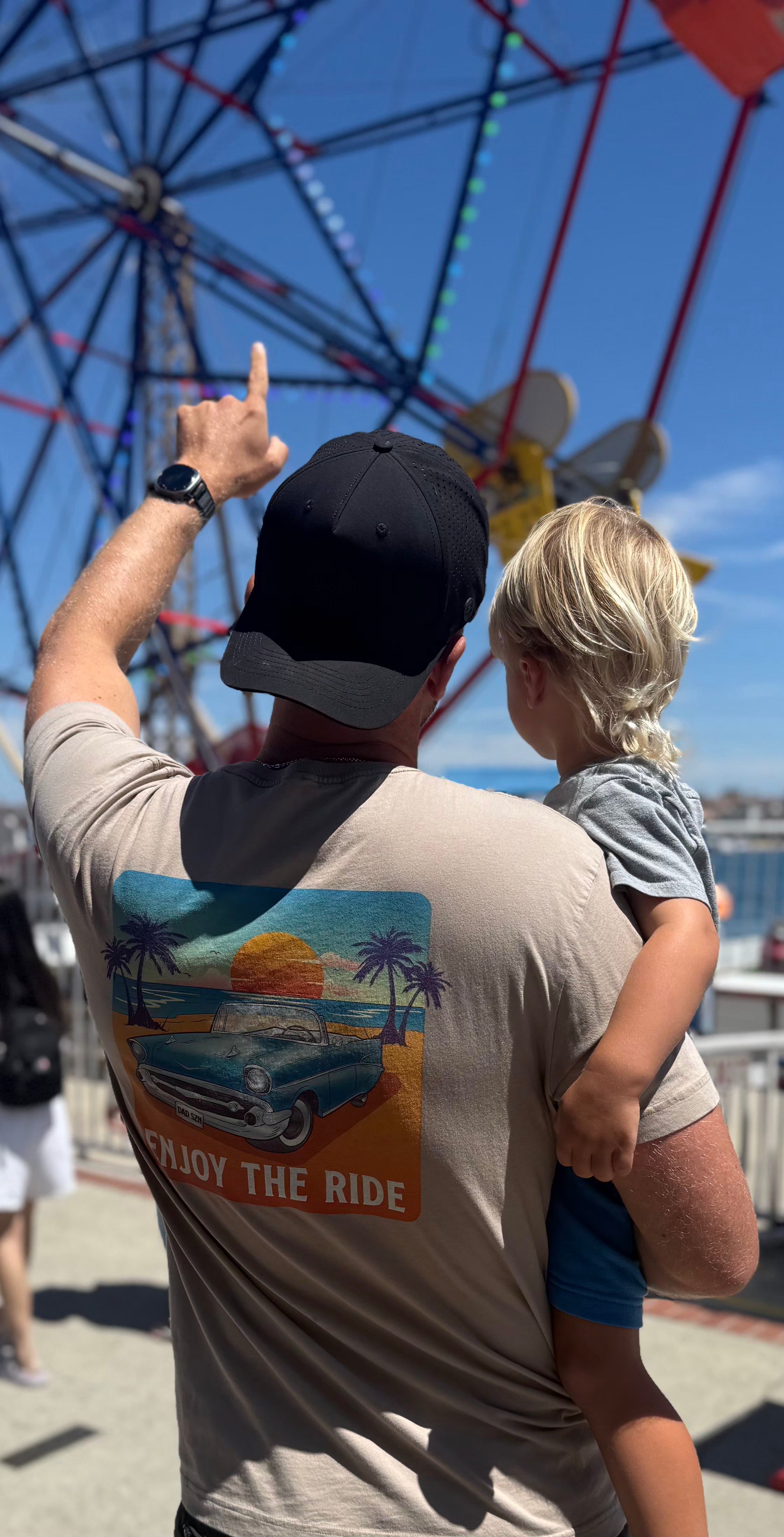 The front features a retro-inspired license plate logo with Dad Season stamped right in the middle—classic, clean, and effortlessly cool. On the back, a vintage blue Chevy cruises through a dreamy scene complete with palm trees and sunset vibes, anchored by the phrase “Enjoy the Ride.” It’s more than a t-shirt—it’s a mindset.
