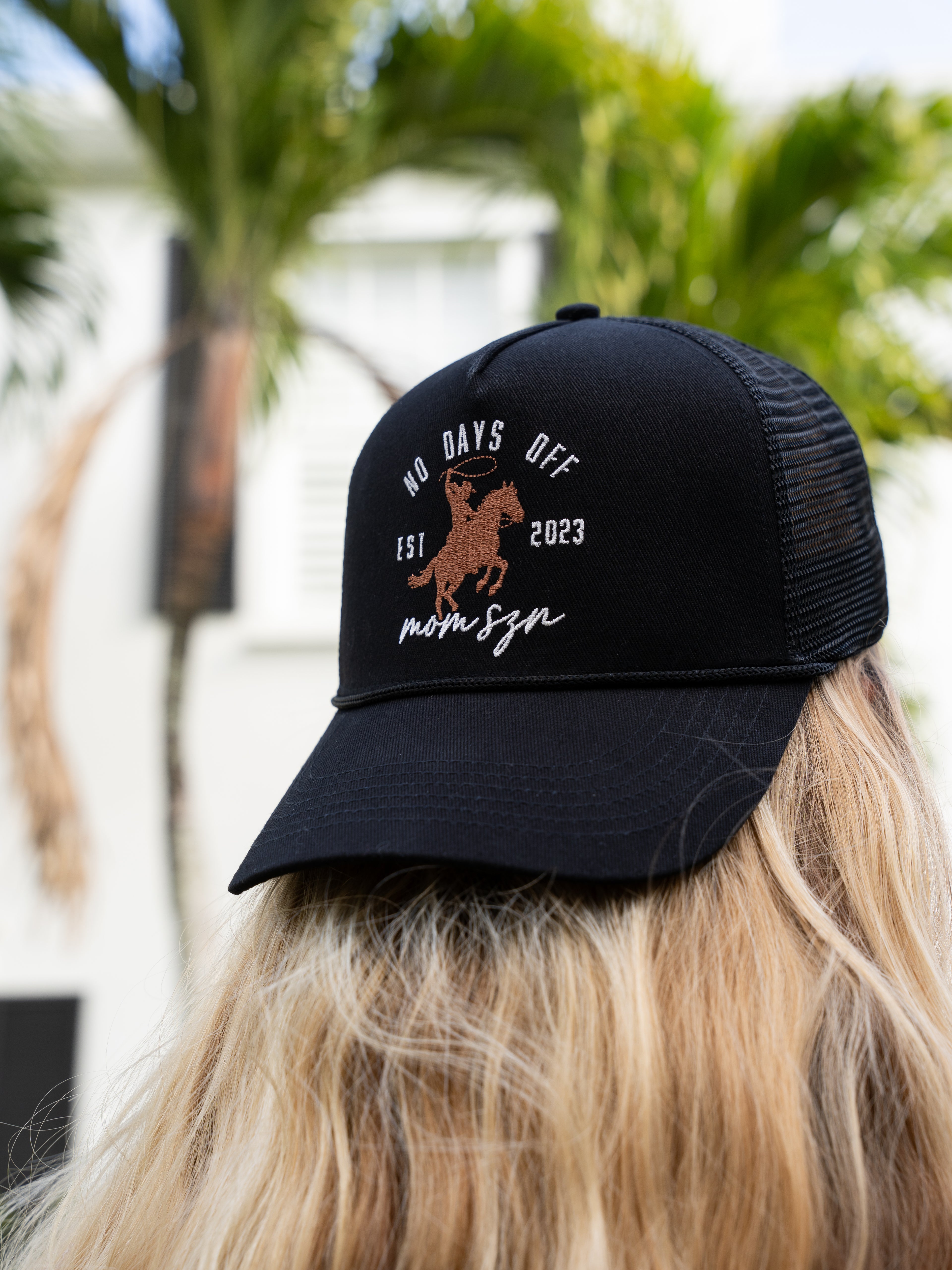 The MOM SZN Western Trucker Hat brings a playful western spirit to our classic everyday cap. Featuring a bold “No Days Off” rodeo-inspired graphic and our Est. 2023 detail, this hat captures the grit, humor, and nonstop energy that motherhood requires.