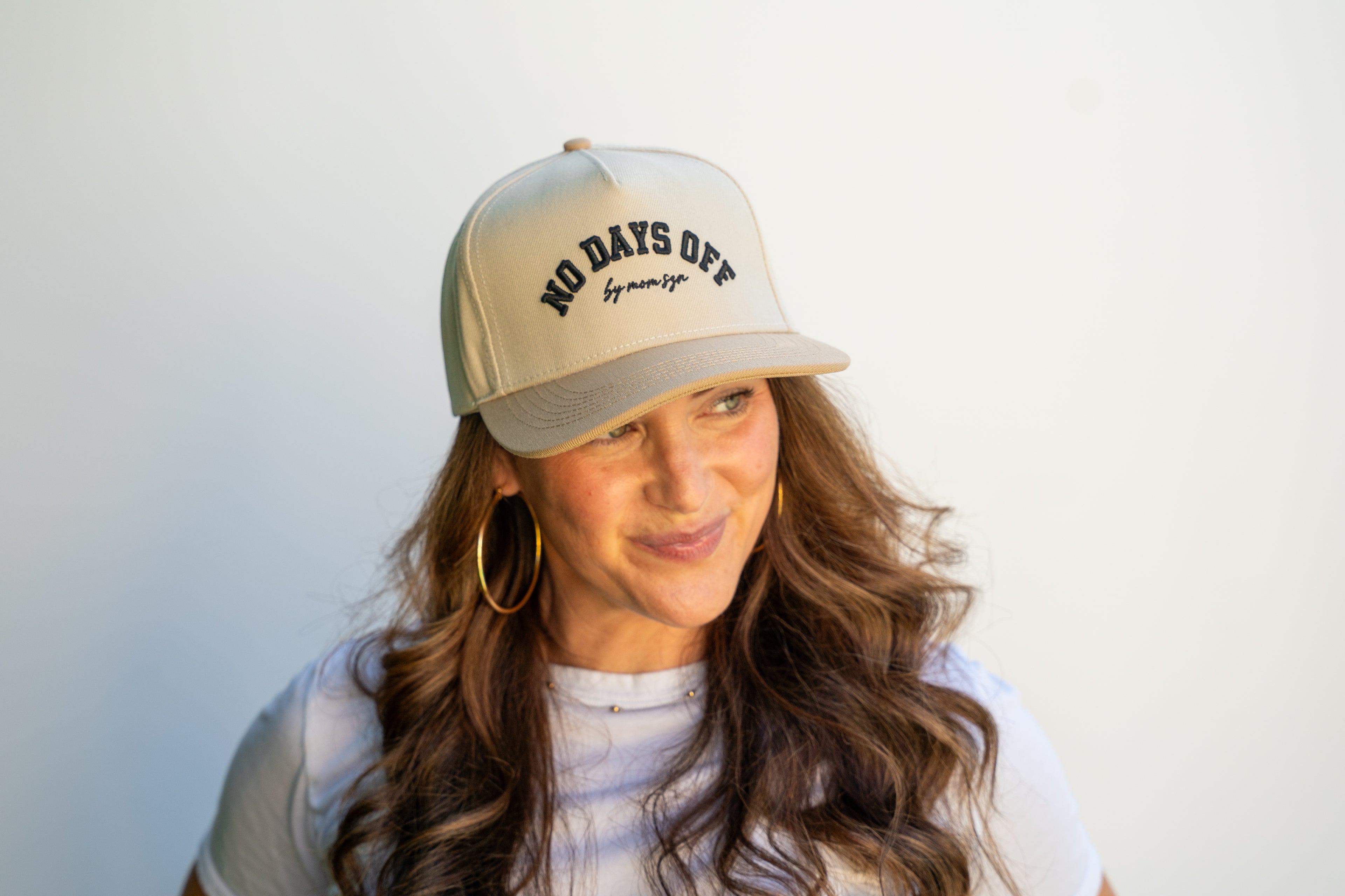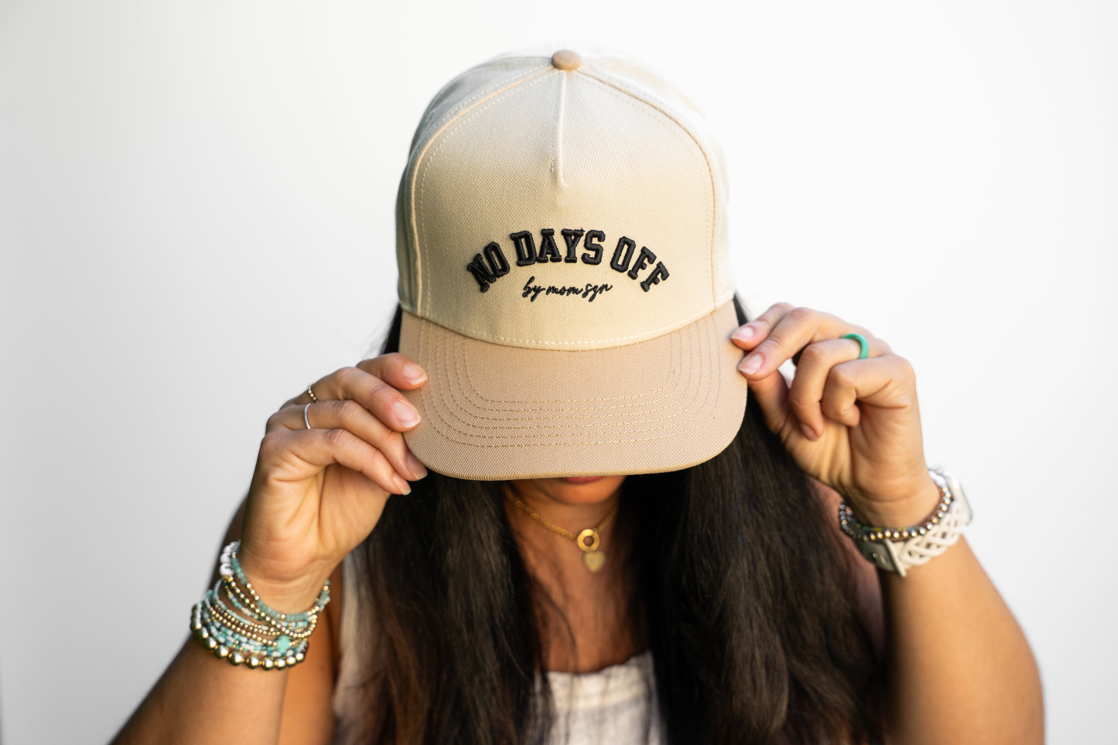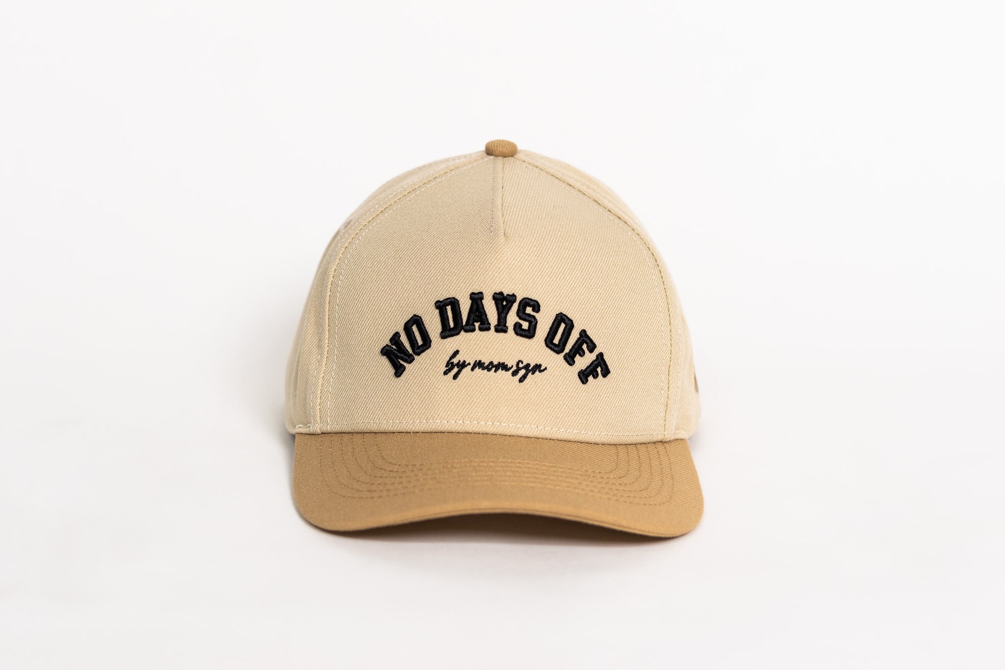 Featuring a light cream crown and a darker taupe bill, this two-tone cap is made with soft cotton and built for comfort, versatility, and everyday wear. On the front: “No Days Off” in bold, raised black stitching—with a graceful “by mom szn” in cursive underneath. Subtle branding continues with a tonal stitched MOM SZN logo on the left temple, for that quiet but confident repping.