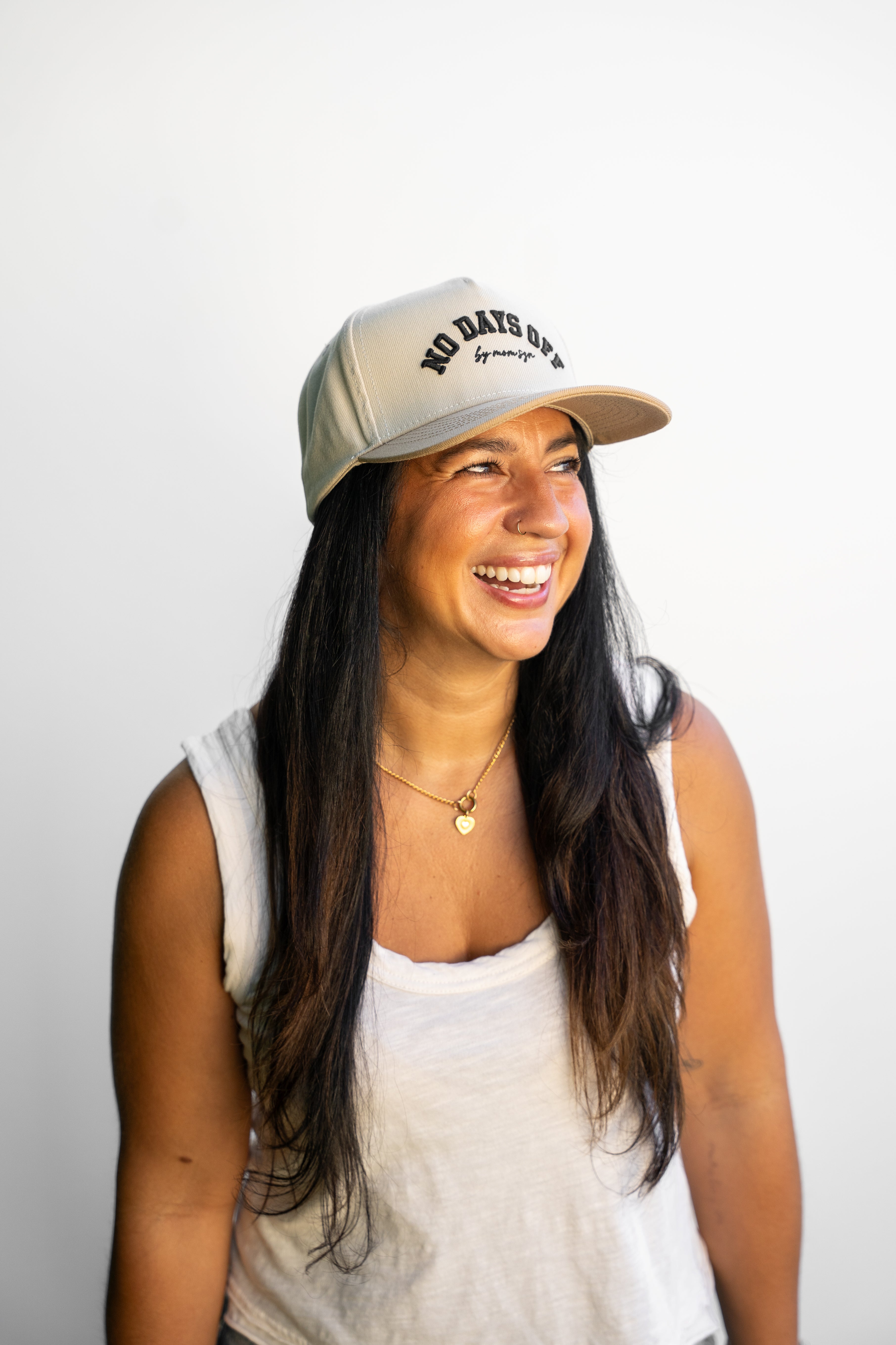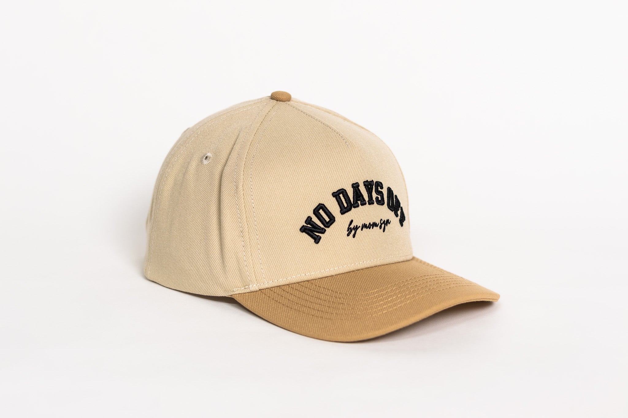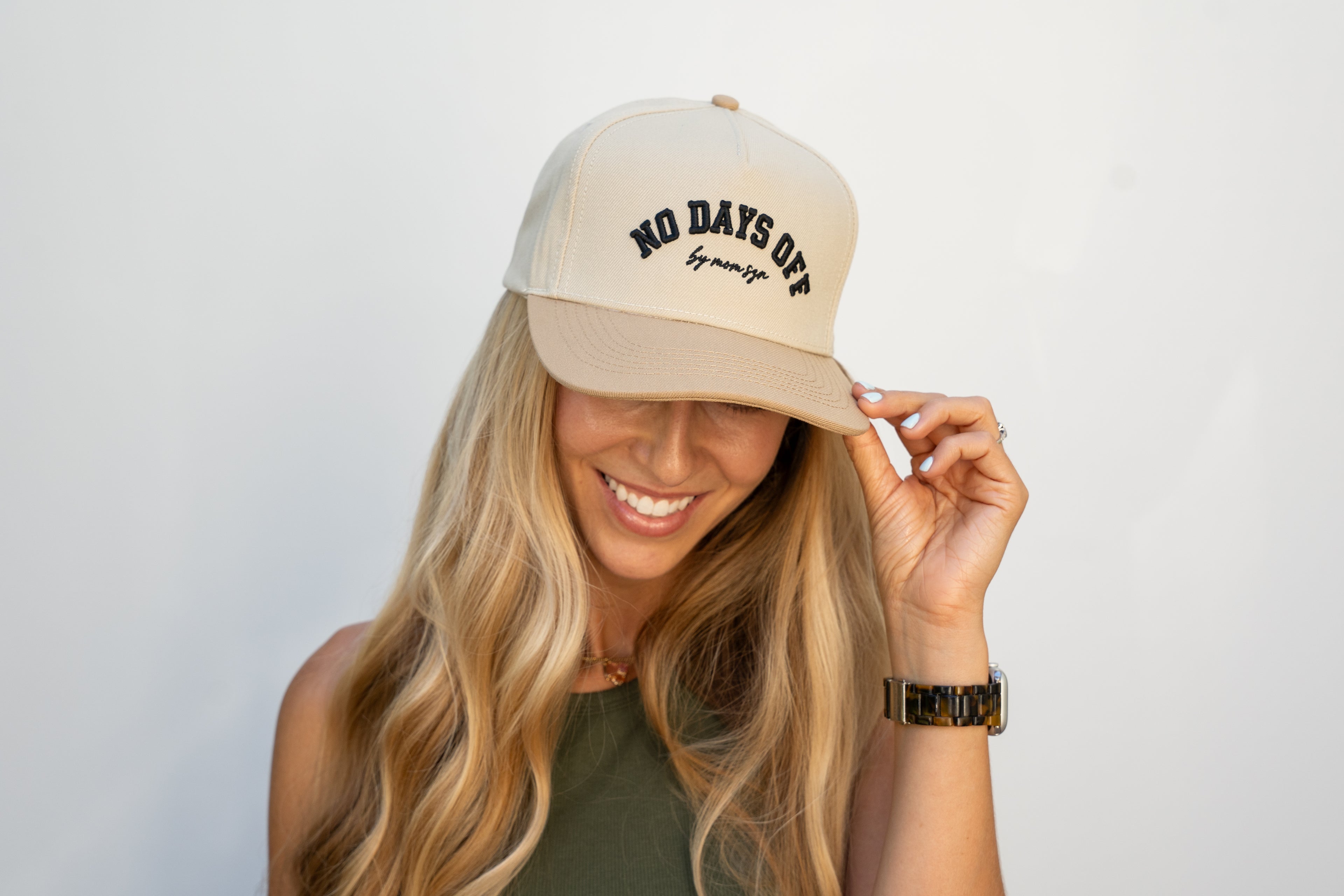 Featuring a light cream crown and a darker taupe bill, this two-tone cap is made with soft cotton and built for comfort, versatility, and everyday wear. On the front: “No Days Off” in bold, raised black stitching—with a graceful “by mom szn” in cursive underneath. Subtle branding continues with a tonal stitched MOM SZN logo on the left temple, for that quiet but confident repping.