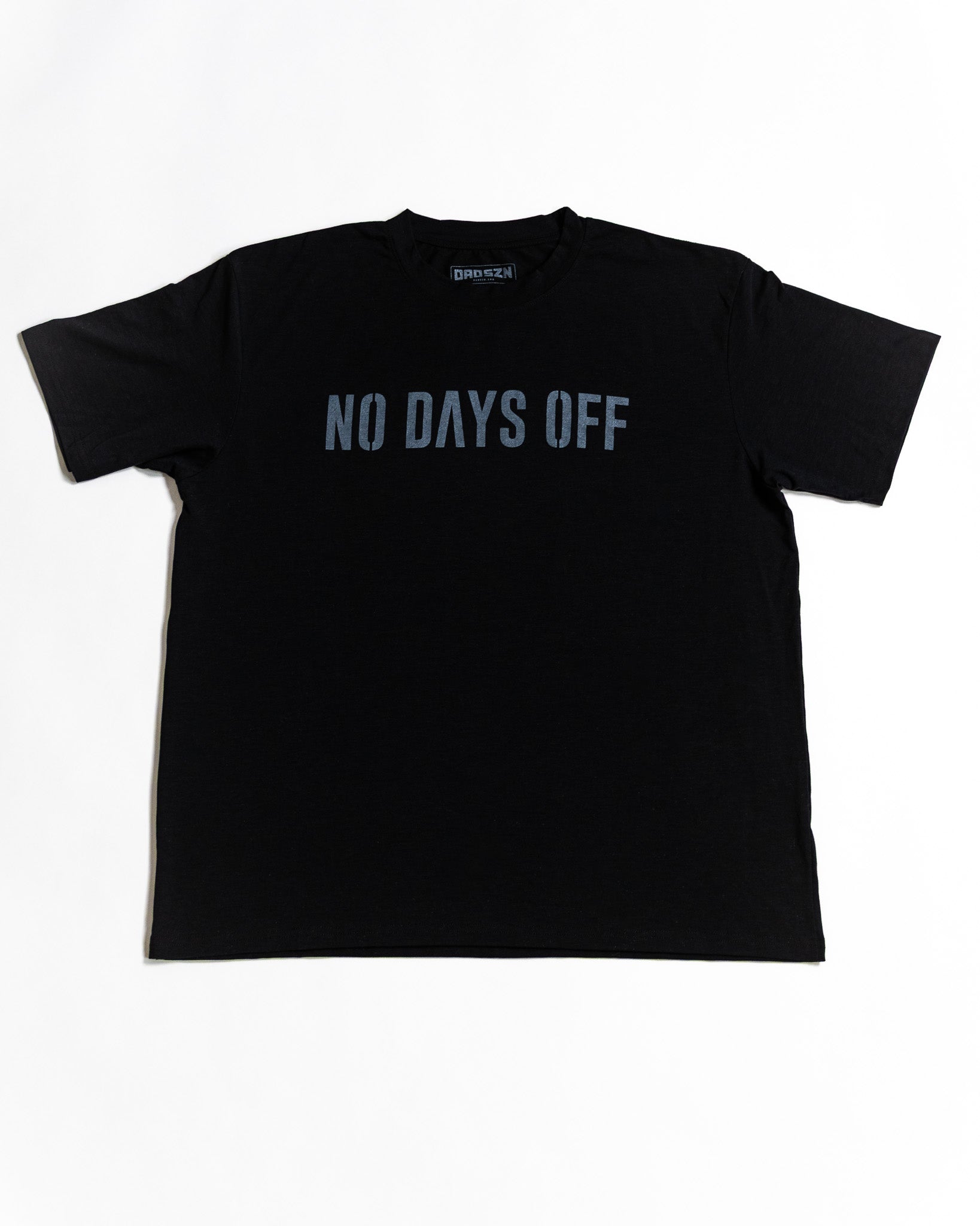 A tonal “NO DAYS OFF” graphic across the chest sets the tone. And down the spine? Our signature DAD SZN stamp in bold grey, running straight from the neck down—because the grind doesn’t stop just because you’re off the clock.