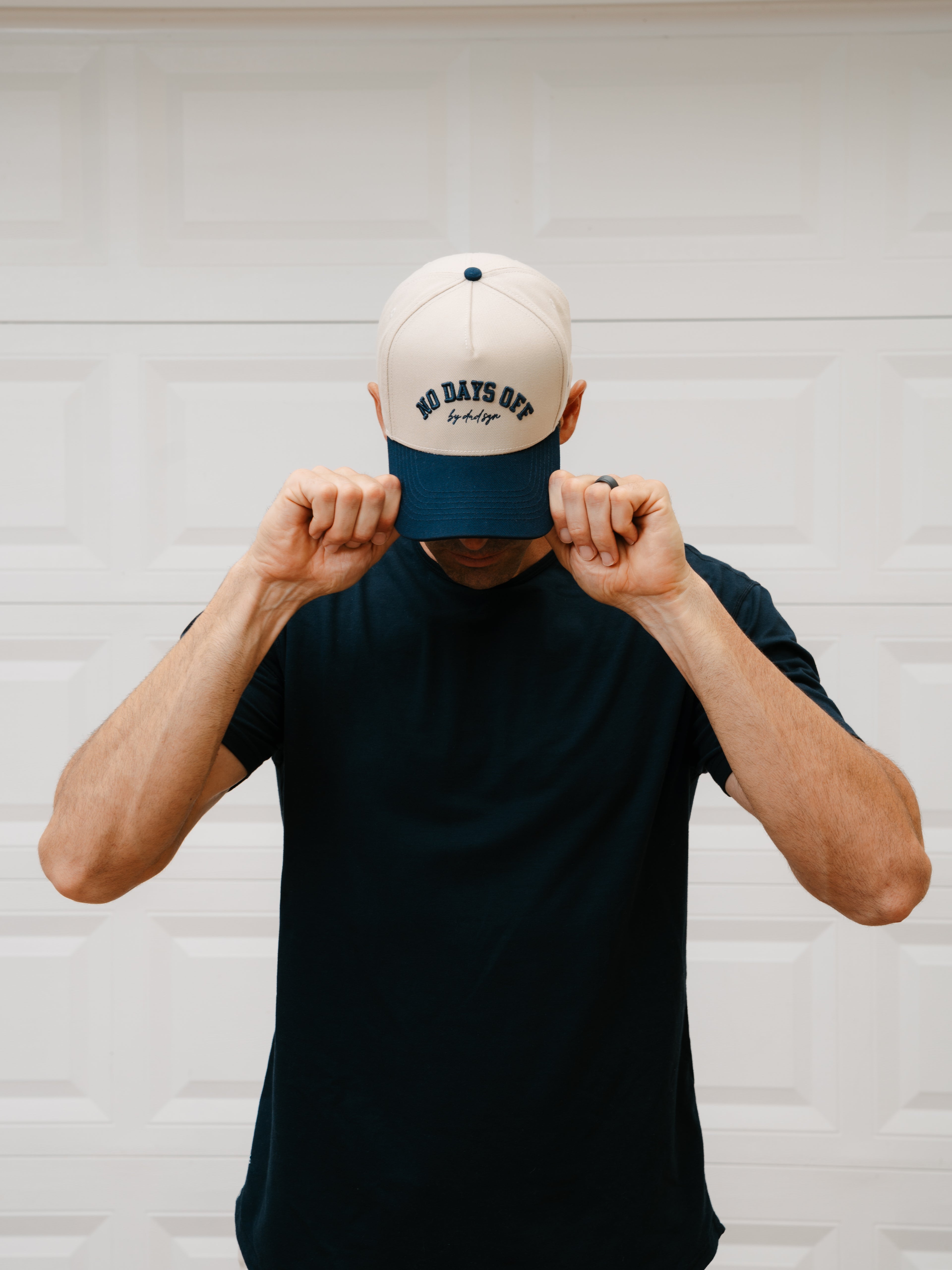 With a cream crown and navy bill, this cap keeps it classic but modern. “No Days Off” is front and center in bold raised navy embroidery, with a quiet signature underneath—“by dad szn” in cursive—for those who know. And on the left temple, a tonal stitched circle DAD SZN logo ties it all together—subtle, but solid.